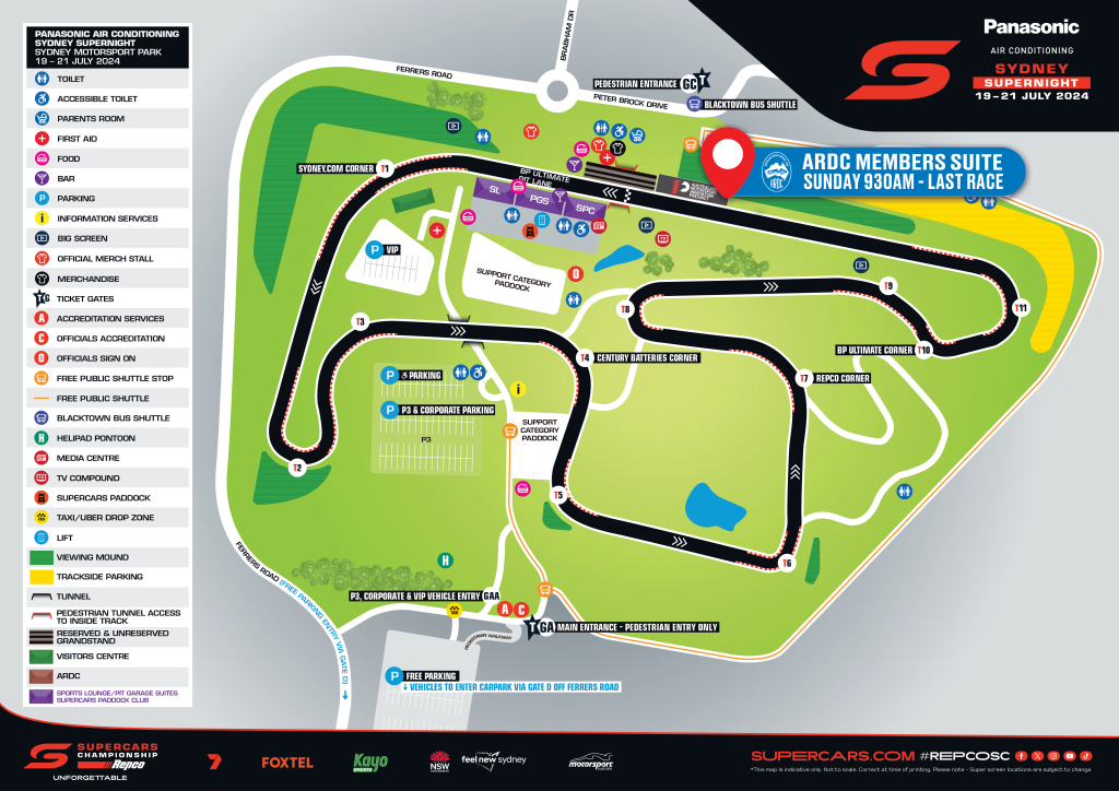 | HOW TO: Enter the venue To take advantage of this offer, all you need to do is show your Membership card at the BOX OFFICE on the day! There will be a box office at each entry gate, so you don’t need to worry about heading to a particular gate. Free Parking is available via Gate D off Ferrers Road, near Sydney Dragway. WHAT IS INCLUDED: ARDC Members have the ability to claim the following for the weekend: Enthusiast, Local Hero, Pit Crew Members: 1x 3-Day GA Pass Foundation (Member Numbers 3200 and below), Official, Competitor, Honorary, Life & Enthusiast Plus Members 2x 3-Day GA Passes If you have Trackside Parking tickets, you will need to enter through Gate B, and claim your tickets there. It is crucial you have an up to date ARDC Membership Card. If you do not have your current ARDC Membership card, please contact the ARDC ASAP so we can assist. DATE CUTOFF: Your 2025 Membership must be renewed or purchased before noon Tuesday February 18, 2025. Trackside Parking and Grandstand upgrades will not be included, they must be purchased separately via the Supercars website. EVENT INFO AND TICKET UPGRADES PARKING Free Parking is available via Gate D off Ferrers Road, near Sydney Dragway. You can find a venue map for where to enter at the bottom of this page. Once your Membership is verified, you will receive a 3-Day GA ticket from the Box Office staff, which you will then use to enter the venue for all three days. NOTE: If you have purchased Trackside Parking tickets, you will need to enter through Gate B, and claim your tickets there. ARDC MEMBERS SUITE FRIDAY 21ST 12PM ‘TIL END OF RACING SUNDAY 23RD 10AM ‘TIL END OF RACING In addition, I’m so excited to share this special bonus for ARDC Members! ARDC Members will have exclusive access to the best seat in the house, the Australian Motorsport Innovation Precinct (AMIP)! Built with motorsport in mind, and kitted out to not miss a minute, the AMIP features: 217″ screen for you to watch all the action, all day long Multiple 86″ screens up and downstairs A balcony directly over the start line, with views of more of the circuit than anywhere else in the venue I can’t wait to see you all there! Ian Hansen Membership, Sustainability, and Community Manager |